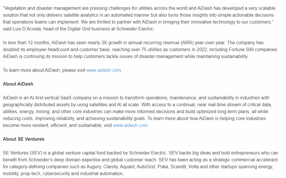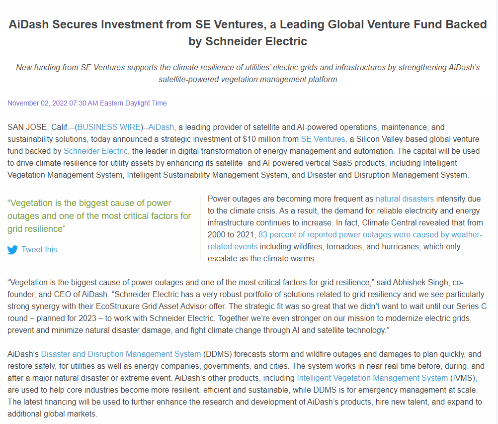 来自加利福尼亚州圣何塞的航天Ai公司AiDash宣布完成新一轮,由SE Ventures领投的1000万美金的融资,至此,AiDash已经完成了累计3300万美金的融资额度。