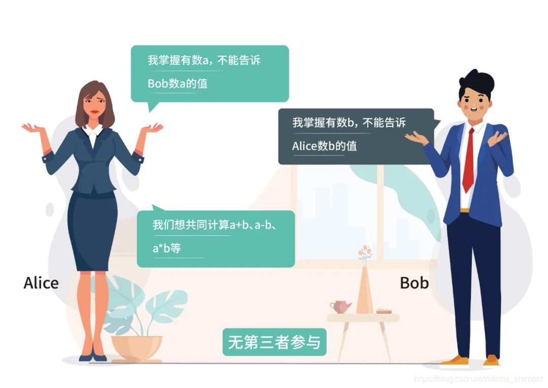 安全双方计算可被通俗的解释为:有两人 Alice 和 Bob,Alice 掌握数 a, Bob 掌握数 b,如何在 Alice、Bob 不告诉对方数 a、b 的具体值情况下,共同利用数 a 和 b 进行计算。