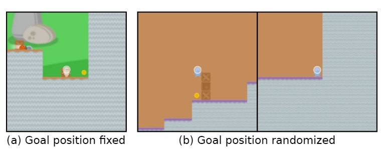 但在测试阶段,金币的位置变成随机的了,智能体每次都会选择到达关卡的结尾处,而没有选择寻找金币,也就是学习到的「目标」错了。