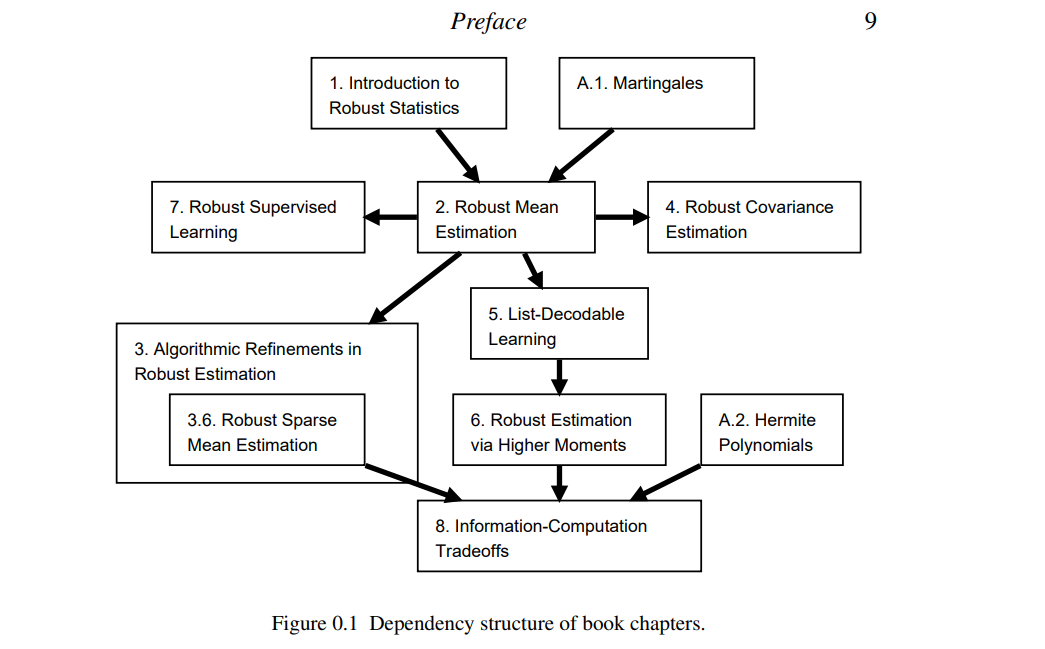 Information-Computation Tradeoffs(信息-计算权衡):第 8 章介绍了一些技术,用于为稳健的统计任务建立信息计算权衡。 Algorithmic High-Dimensional Robust Statistics 算法高维鲁棒统计