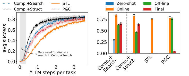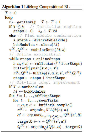 【推荐理由】人类解决复杂问题的方法通常是将其分解为较容易的子问题,然后将子问题的解决方案结合起来。这种类型的组合推理允许在处理共享部分基本组合结构的未来任务时重复使用子问题的解决方案。在持续或终身强化学习(RL)的环境中,这种将知识分解成可重复使用的组件的能力将使智能体能够通过利用积累的组合结构快速学习新的RL任务。本文探索了一种基于神经模块的特殊形式的组合,并提出了一组直观地承认组合解决方案的RL问题。从经验上看,本文证明了神经组合确实捕捉到了这个问题空间的基本结构。并且本文进一步提出了一种组合式的终身RL方法,该方法利用积累的神经组件来加速学习未来的任务,同时通过重放经验的离线RL来保留先前任务的性能。