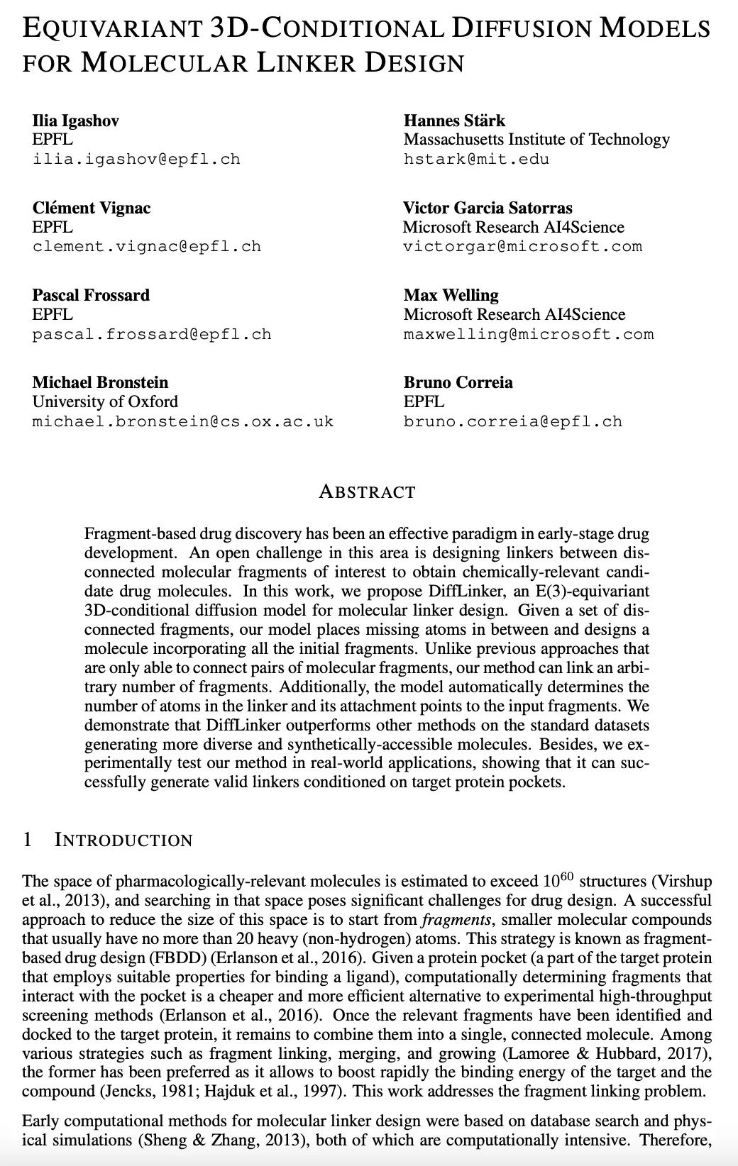 1、[LG] Equivariant 3D-Conditional Diffusion Models for Molecular Linker Design