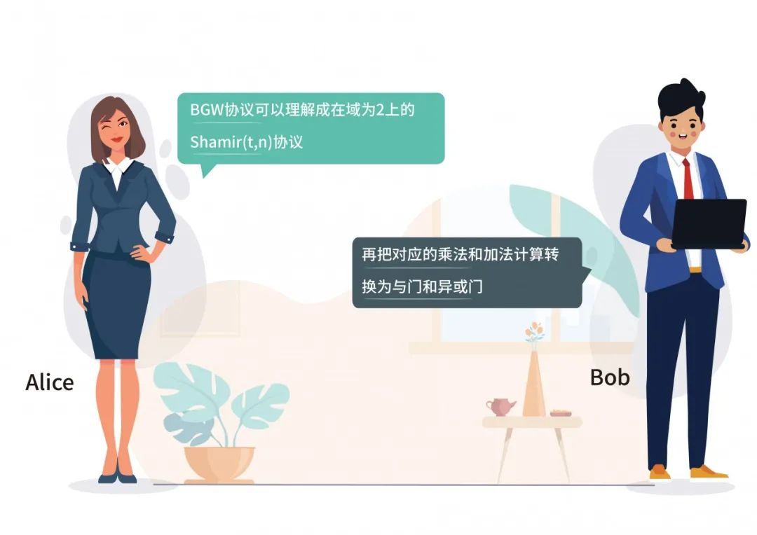 这里Bob得到的子秘密异或上Alice得到的子秘密即为𝑎⋀𝑏的值。