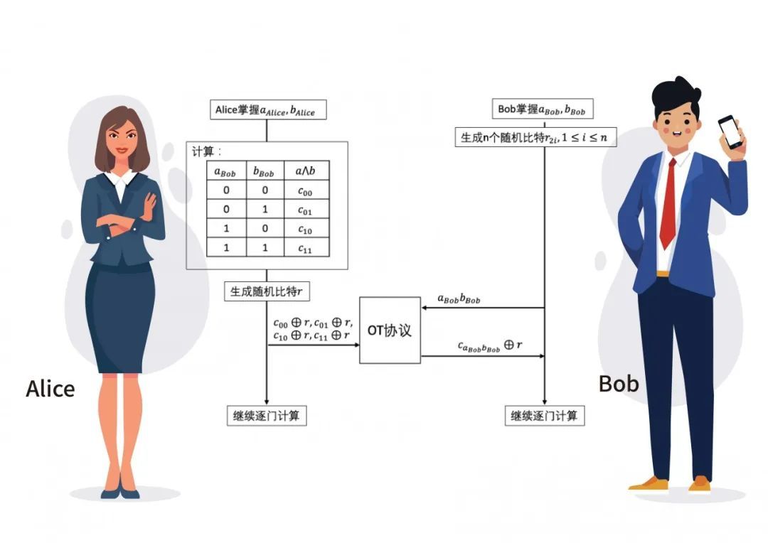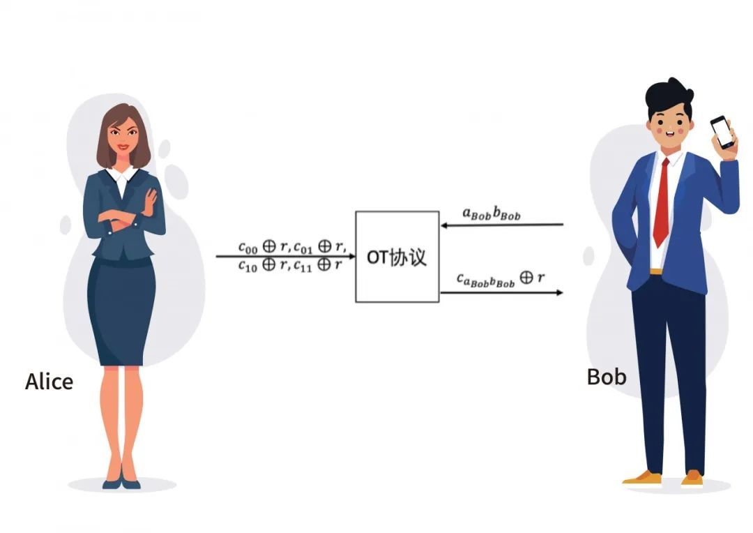 由于Alice和Bob双方间执行的是不经意传输协议,Alice不知道Bob 在𝑐00⨁𝑟, 𝑐01⨁𝑟, 𝑐01⨁𝑟, 𝑐11⨁𝑟中选择了哪个,保证了aBob𝑏Bob依旧对Alice保密。