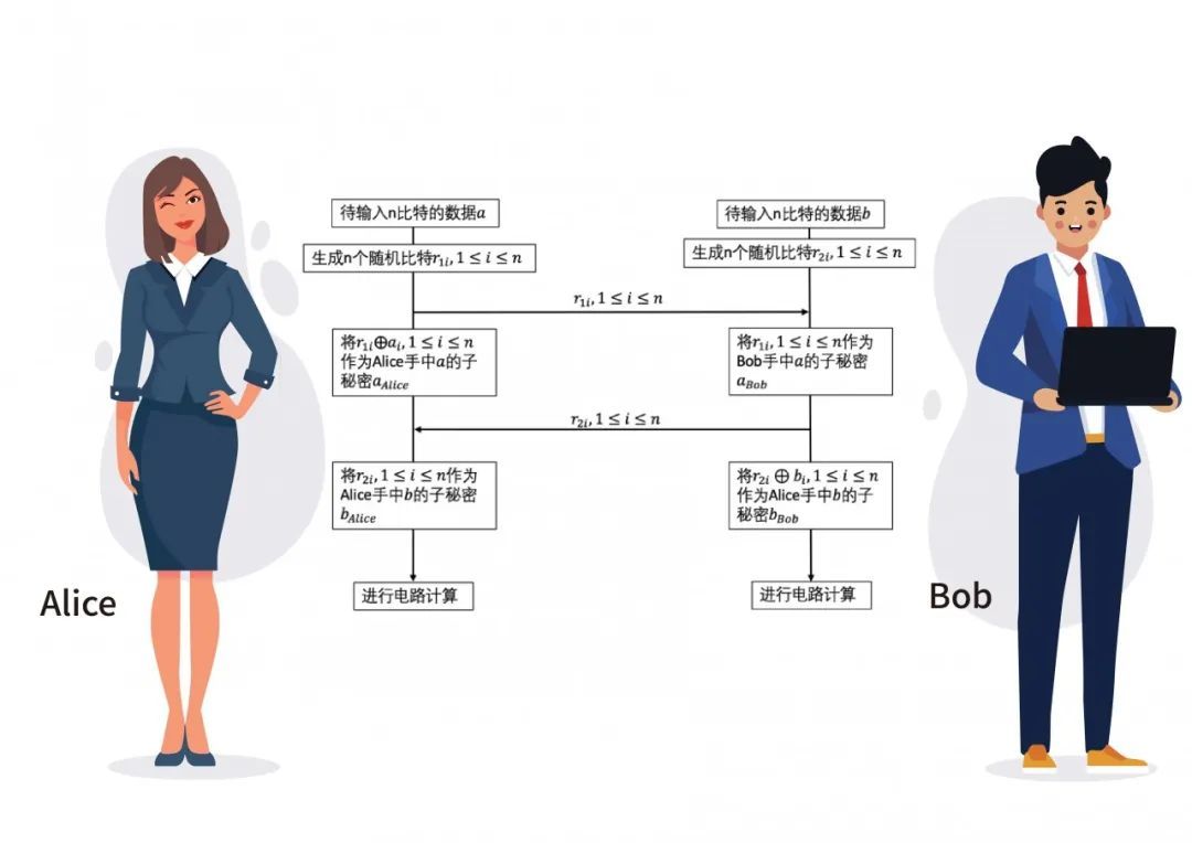 即Alice掌握了𝑎和b的子秘密𝑎Alice和𝑏Alice,𝑎Alice=𝑎⨁𝑟1𝑖,𝑏Alice=𝑟2𝑖,Bob掌握了𝑎和b的子秘密aBob和𝑏Bob,aBob=𝑟1𝑖,𝑏Bob= 𝑏⨁𝑟2𝑖。