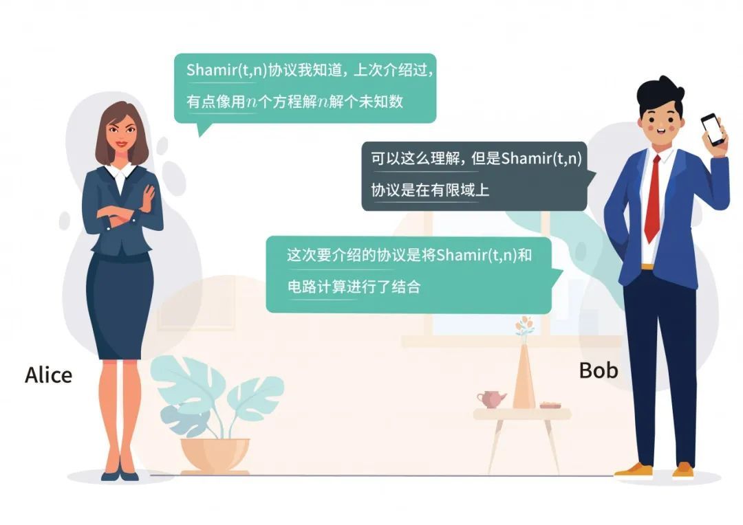 BGW协议也是支持多方的安全计算协议,BGW协议基于Shamir(t, n)门限秘密共享机制,利用了Shamir秘密共享机制的加法同态和乘法同态的性质。Shamir(t, n)门限秘密共享机制在之前的科普已经进行过介绍了。