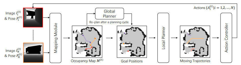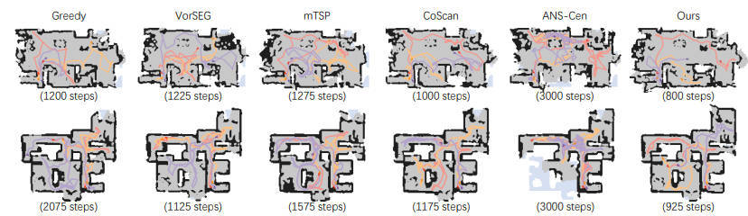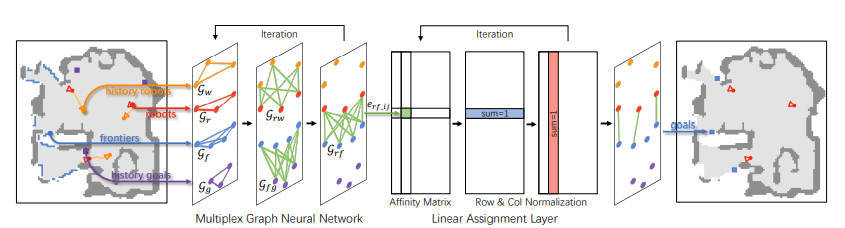 本文将问题简化为二分图匹配,它建立了两个图之间的节点对应关系,表示机器人和边界。文中引入了一个多路图神经网络 (mGNN),它学习神经距离以填充亲和矩阵,从而实现更有效的图匹配。并且通过强化学习最大化有利于时间效率和地图完整性的长期值,使用可微分线性分配层优化 mGNN。实验结果表明此算法在各种室内场景和未知数量的机器人上具有卓越的性能和出色的泛化能力。