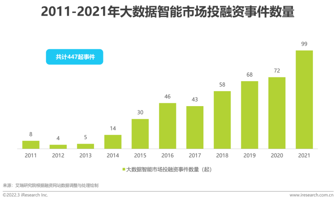 从2011-2021年的投资数量来看,资本市场对大数据智能市场的关注度不断提高,融资事件逐年攀升,2021年大数据智能市场单年投融资数量已高达99起;从2011-2021年的融资轮次来看,C轮及早期投融资事件占比达到50%。受政策的高度支持与技术的成熟推动,大数据智能应用在多行业的成功落地极大地增强了市场与投资者的信心,“大数据智能”标签已成为市场创业与投资的热点,具备市场想象空间与明确使用价值是企业早期吸引投资的关键。