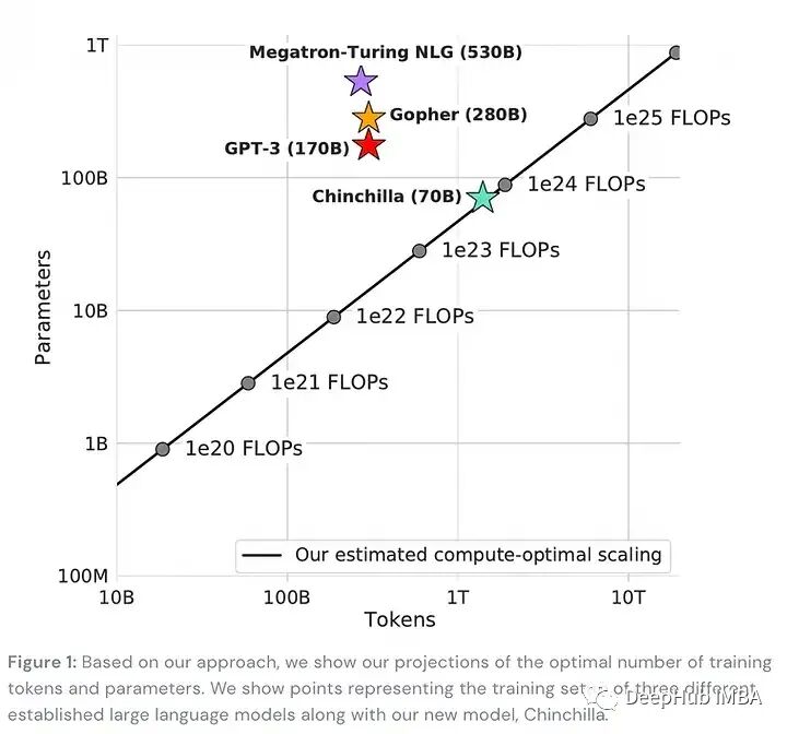 💡最好在更多的令牌上训练一个更小的语言模型。DeepMind用他们的70B参数的Chinchilla模型展示了这一点,其性能优于更大的模型,如Gopher (280B)、GPT-3 (175B)或Megatron-Turing NLG (530B)。