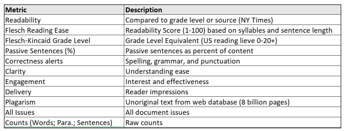 每个文本块输出都为可为 Grammarly 指标提供数据,并设定了基于受众:专家,形式:中性,领域:一般,当中应用大多数语法规则和约定,具有中等严格性。