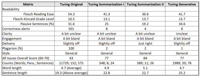 在 PeopleTec 的一项研究中,作者将图灵测试的原始论文内容作为 prompt,让 ChatGPT 重新生成一个更具可信性度的论文版本,并使用写作评估工具进行评估。