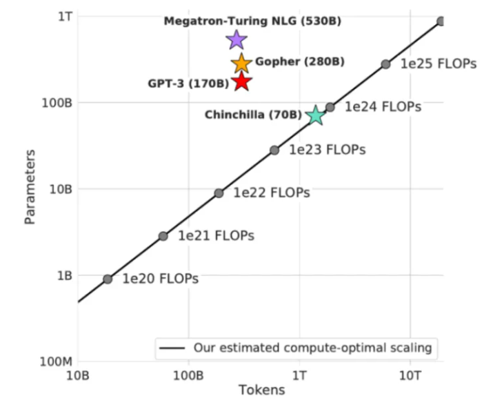 然而,DeepMind证伪了OpenAI的大模型缩放法则,重现定义了最优模型训练的参数规模和训练数据量之间的关系,再此基础上训练了最优的语言模型Chinchilla,实现了700亿参数量性能超越5300亿参数量的MT-NLG。