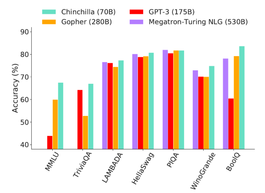 通过将Chinchilla和其他大模型在问答能力、常识、阅读理解和大型多任务语言理解能力基准数据集上进行比较,Chinchilla的评测结果都显著优于Gopher,甚至比参数规模是其7.6倍的MT-NLG性能都优越,稳坐大模型性能排行的第二把交椅(第一是目前参数规模最大的模型PaLM)。