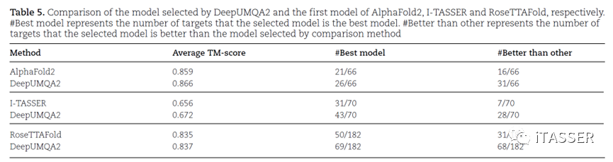 DeepUMQA2可以用于选择主流蛋白质结构预测方法的“最佳模型”。论文从CASP14官网收集了AlphaFold2预测的66个目标和I-TASSER预测的70个目标的前5个模型。此外,他们还从CAMEO官网收集了RoseTTAFold在2022年3月11日至6月04日三个月内预测的182个目标的前5个模型。分别对这三种方法预测的结构模型进行评估,并从中选择评估得分最高的模型与这些方法给出“最佳模型”进行比较。表5给出了与AlphaFold2、I-TASSER和RoseTTAFold的比较结果。