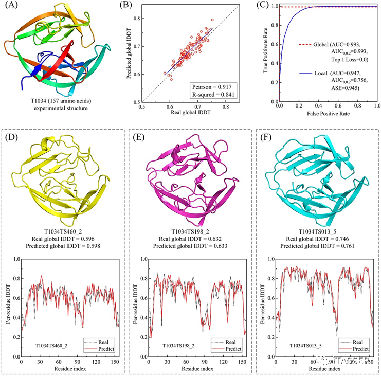 图5给出了对CASP14目标T1034的定量分析,该目标包含145个预测模型,真实的全局lDDT分布在[0.582,0.752]。图5B显示了这145个模型上真实的全局lDDT和DeepUMQA2预测的全局lDDT的比较,结果显示它们相关性很高,Pearson相关系数为0.917,R2为0.841,根据预测的全局lDDT选择的“最佳模型”为真实的最佳模型。图5C绘制了全局和局部ROC曲线,全局AUC和AUC0,0.2均为0.993,局部AUC和AUC0,0.2分别为0.947和0.756,ASE为0.945。图5D-5F显示了三种不同精度模型的结构,其对应的预测和真实的lDDT,以及每个残基的预测和真实的lDDT得分。可以发现,DeepUMQA2预测的每个残基lDDT能够捕捉残基精度变化趋势,且易于区分残基的高、低精度区域,为模型的进一步细化提供有利信息。