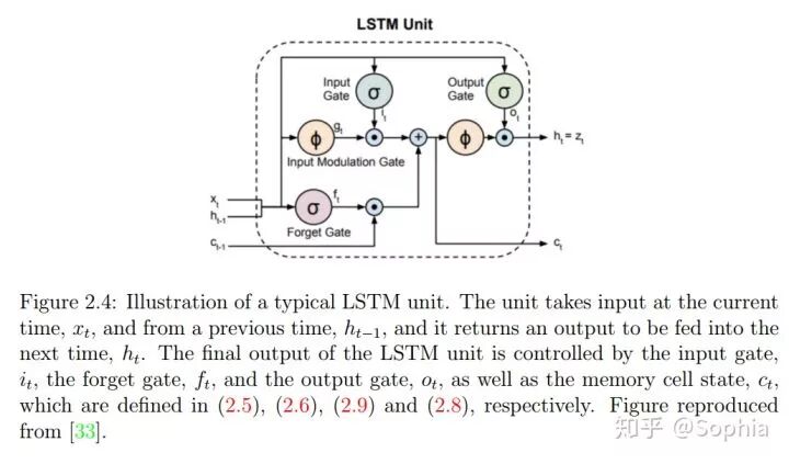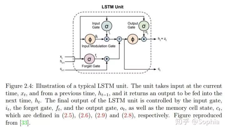 图 2.4:典型 LSTM 单元示意图。该单元的输入是当前时间的输入和前一时间的输入,然后它会返回一个输出并将其馈送给下一时间。LSTM 单元的最终输出由输入门、输出门和记忆单元状态控制。图来自 [33]