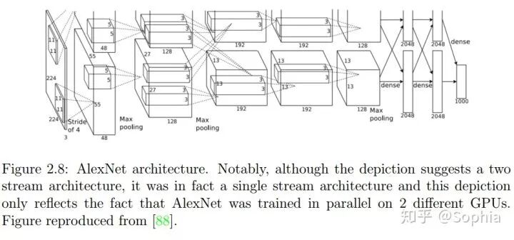 图 2.8:AlexNet 架构。需要指出,虽然从图上看这是一种有两个流的架构,但实际上这是一种单流的架构,这张图只是说明 AlexNet 在 2 个不同 GPU 上并行训练的情况。图来自 [88]