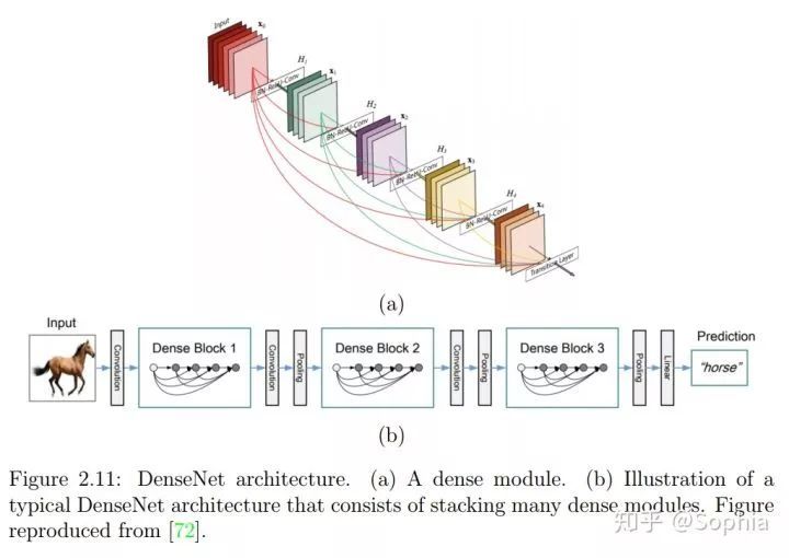 图 2.11:DenseNet 架构。(a)dense 模块。(b)(b)由层叠的许多 dense 模块构成的典型 DenseNet 架构的示意图。图来自 [72]