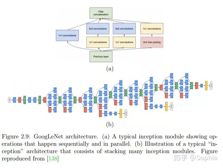 图 2.9:GoogLeNet 架构。(a)典型的 inception 模块,展示了顺序和并行执行的操作。(b)由层叠的许多 inception 模块构成的典型 inception 架构的示意图。图来自 [138]