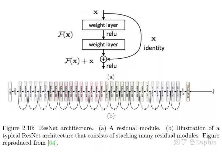 图 2.10:ResNet 架构。(a)残差模块。(b)由层叠的许多残差模块构成的典型 ResNet 架构示意图。图来自 [64]