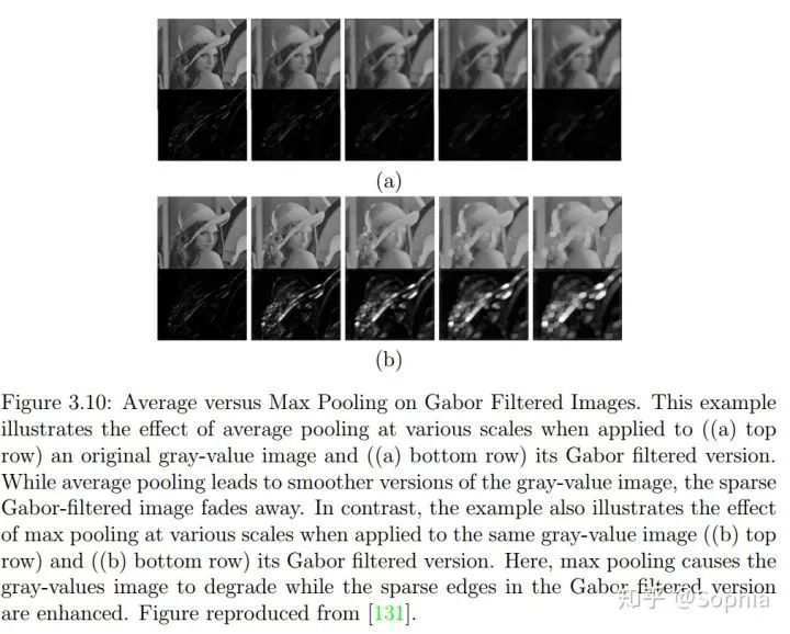 (a)展示了不同尺度的平均池化的效果,其中(a)中上面一行是应用于原始灰度值图像的结果,(a)中下面一行是应用于 Gabor 滤波后的图像上的结果。平均池化能得到灰度值图像的更平滑的版本,而稀疏的 Gabor 滤波后的图像则会褪色消散。相对而言,(b)给出了不同尺度的最大池化的效果,其中(b)中上面一行是应用于原始灰度值图像的结果,(b)中下面一行是应用于 Gabor 滤波后的图像上的结果。这里可以看到,最大池化会导致灰度值图像质量下降,而 Gabor 滤波后的图像中的稀疏边则会得到增强。图来自 [131]