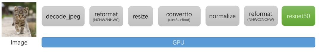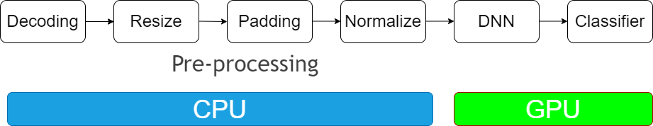 图像分类是最常见的 AI 图像算法之一,通常可以用于物体识别,以图搜图等场景,几乎是所有 AI 图像算法的基础。图像分类的 pipeline 大体可以分为 2 个部分:前处理部分和 DNN 部分。其中前处理部分,在训练和推理过程中最常见的 4 种操作包括:图片解码、Resize、Padding、Normalize。DNN 部分已经有了 GPU 的加速,而前处理部分通常都会使用 CPU 上的库函数进行处理。如果能够把前处理部分也移植到 GPU 上,那么一方面可以释放 CPU 资源,另一方面也可以进一步提升 GPU 利用率,从而可以对整个 pipeline 进行加速。