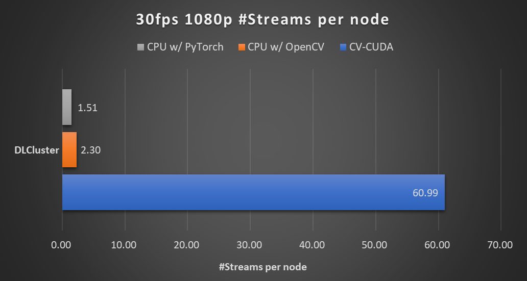 在本文开头的背景模糊算法里,采用 CV-CUDA 替代 OpenCV 和 TorchVision 的前后处理后,整个推理流程的吞吐率提升了 20 倍以上。下图展示了在同一个计算节点上(2x Intel Xeon Platinum 8168 CPUs , 1x NVIDIA A100 GPU),以 30fps 的帧率处理 1080p 视频,采用不同的 CV 库所能支持的最大的并行流数。测试采用了 4 个进程,每个进程 batchSize 为 64。