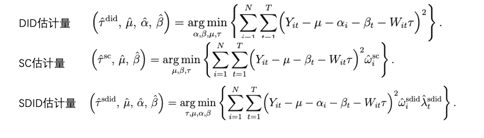 双重差分法和合成控制法其实都可以统一在一套分析框架体系内。研究Arkhangelsky et al. (2021)指出,双重差分是在解决一个没有任何个体或者时间上加权的双向固定效应回归问题,而合成控制法是在政策干预发生前的个体施加权重ω来拟合被干预的个体,这篇论文结合两种方法提出了一个新的估计量:合成双重差分(SDID),既包括个体上的权重ω,也包括时间上的权重λ,从而提升了整体估计量的稳健性效果。这里的时间的权重λ可以理解为和干预发生后更相似的时期的数据时期被赋予了更高的权重。