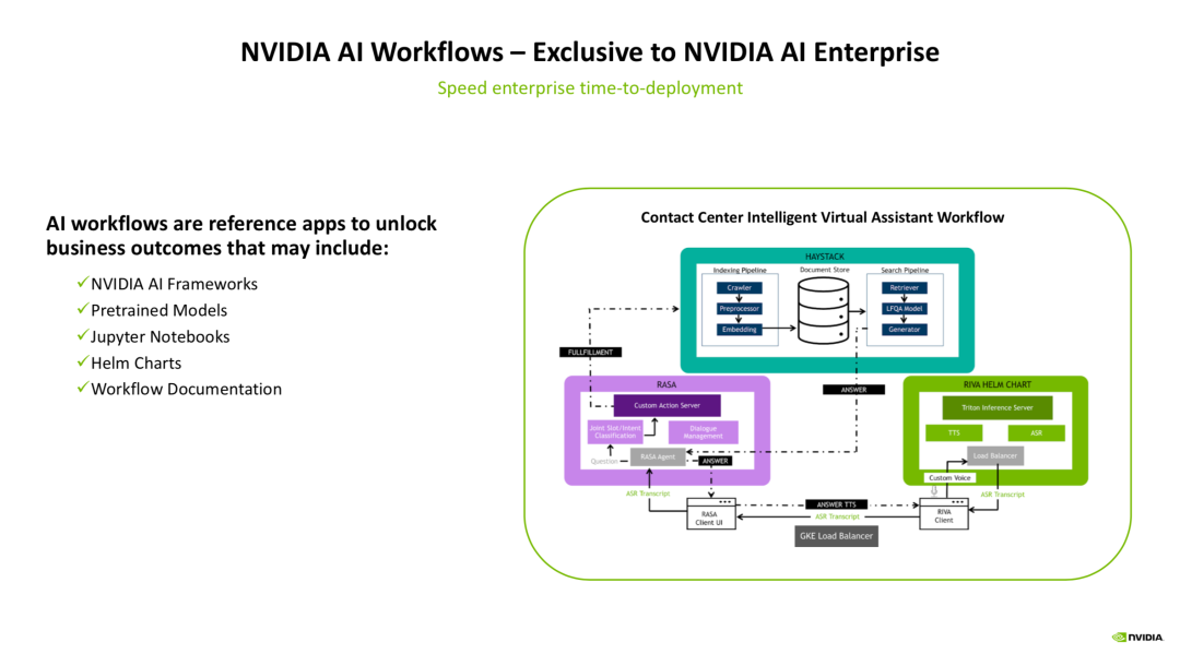 最右下角是一个基于RIVA的工作流,在这里面会完成语音转文字(ASR)、文字转语音(TTS)的操作,来作为智能虚拟助手的“输入预处理”和“输出预处理”操作。而后,经过RIVA得到的用户输入,会被输入到左边的RASA工作流。