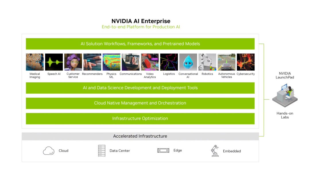 日前,NVIDIA 发布了AI Enterprise 3.0(简称NVAIE 3.0),包括了模型的训练、推理优化、部署、模型管理、云原生管理等AI应用开发上线的全流程,之前需要耗时数个月才能开发完成的AI应用,在NVAIE 3.0平台下,可以做到数小时完成。