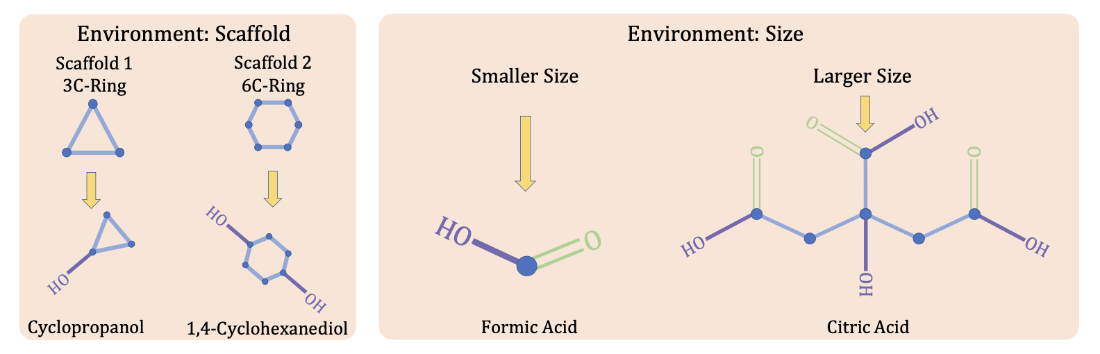 先看左边这一组分子,可以看到他们的分子骨架(scaffold)不同,一个是由3个碳原子构成的环,而另一个是由6个碳原子构成的环。而分子骨架可以被视作一种环境划分的依据,所以这两个分子来自于不同的环境,即来自不同的分布,但他们都含有一个共同的子结构羟基(-OH),所以他们都易溶于水。通过这个例子,我们可以知道羟基和水溶性之间存在一种相对于环境稳定不变的关联性。再看右边的一组分子,可以看到他们的分子尺寸(size)差异明显,分子尺寸可以理解为所含原子数目,而分子尺寸也可以作为环境划分的依据,所以这两个分子也是来自于不同的环境(分布)。