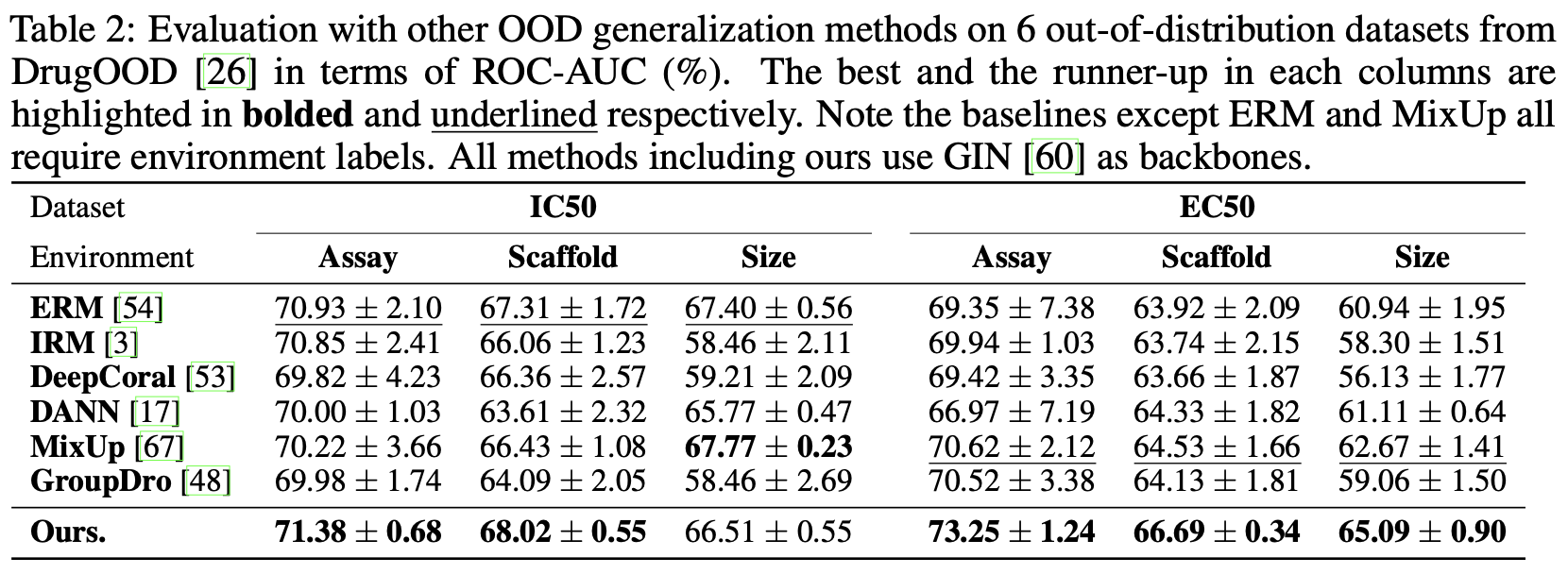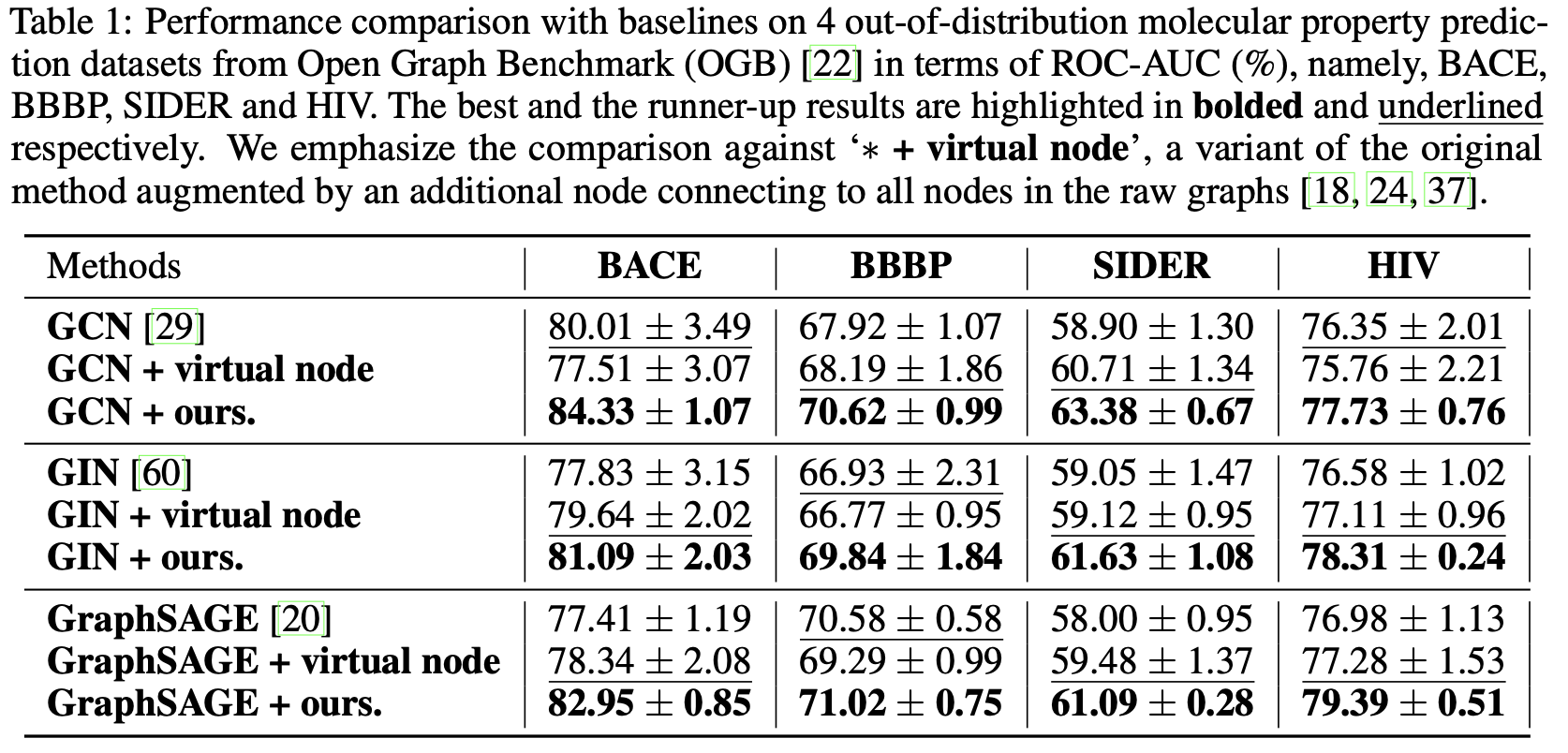 Baseline: 理论上,任何现有的分子表示学习模型都可以嵌入到我们的框架中作为我们的骨干模型(backbone)来提升他们原本的泛化能力。我们选取了三种模型:GCN,GIN 和 GraphSAGE 作为骨干模型来验证我们的方法是否会给他们的泛化能力带来提升,并且我们还和他们的增加版模型进行了比较,即加上虚拟节点,也就是下面实验结果表格中的"+ virtual node"。此外,我们还和现有的六种 OoD 泛化方法进行了比较: ERM,IRM, DeepCoral, DANN, MixUp 和 GroupDro。