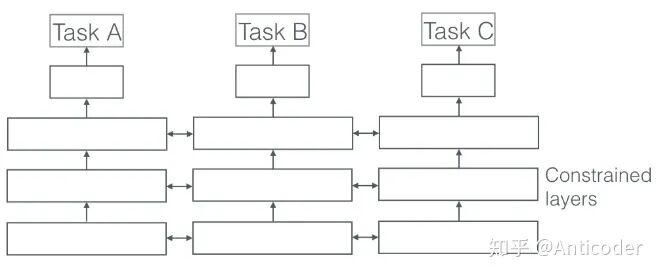 在所有任务中共享一些参数(一般底层),在特定任务层(顶层)使用自己独有参数。这种情况,共享参数得过拟合几率比较低(相对非共享参数),过拟合的几率是O(#tasks). [1]