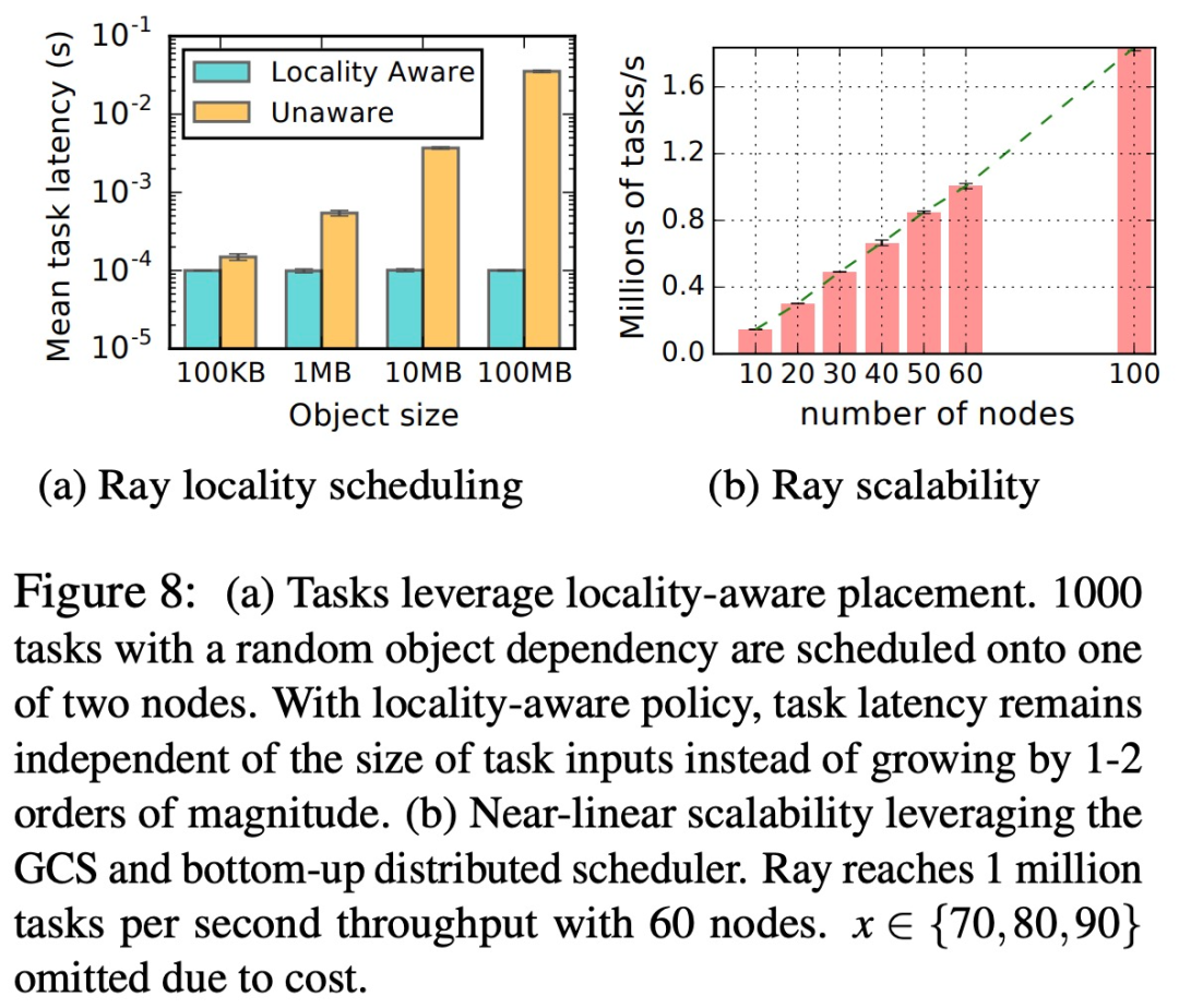 作为一个分布式计算框架,Ray 有两个关键优势,分别是位置感知(Locality-aware)和任务分配(task placement)。如下图所示,Ray 能够横向扩展系统,以支持高吞吐量的细粒度任务,同时保持容错和低延迟任务调度。