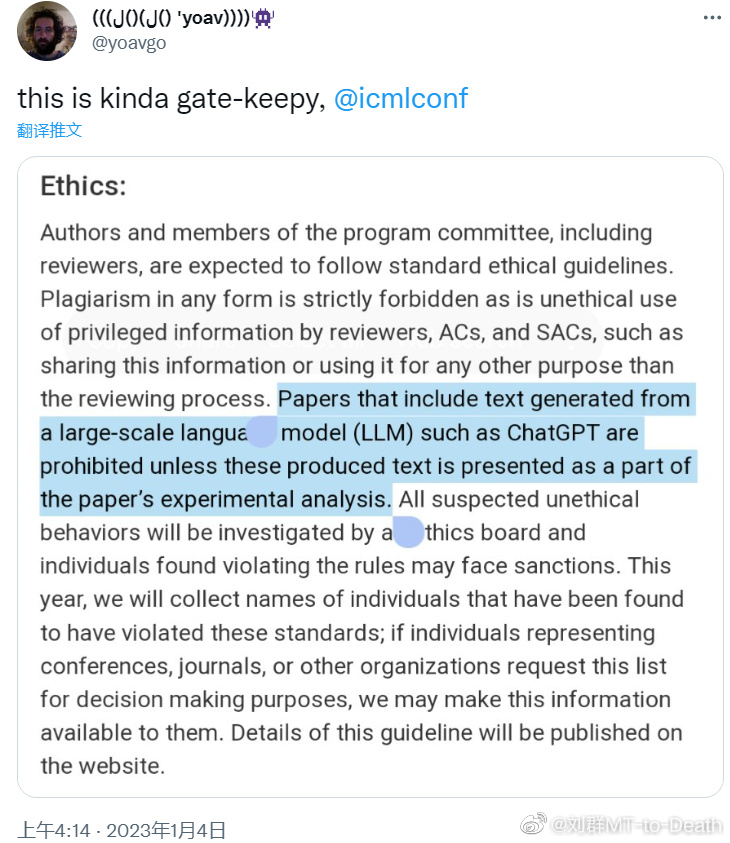 1月4日,Twitter的一条转发引起热议,机器学习顶会ICML投稿禁止包含大语言模型(LLM,比如ChatGPT)生成的文本,除非是用做实验分析。