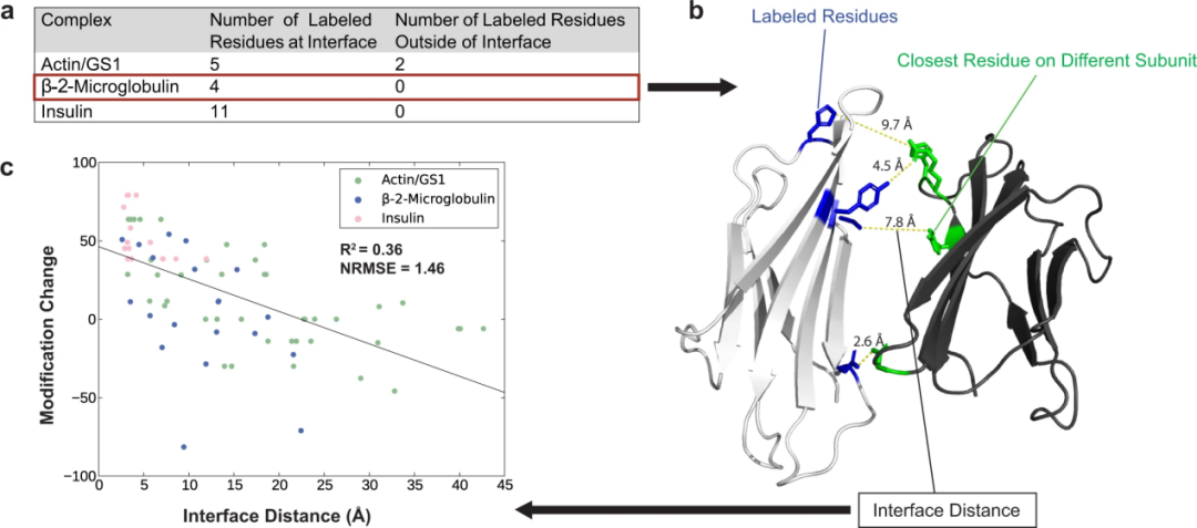 此外,我们假设在比较未结合和结合状态时,特定残基与结合界面的距离越大,溶剂可及性变化就越小。出于这个原因,我们希望复合体的未绑定/绑定状态之间的修改变化较小。将所有三个复合物的所有标记数据与这些标记残基的界面距离结合起来,可以进行更全面的分析(图2c)。在修饰变化(实验数据,y 轴)和标记残基的界面距离(天然结构,x 轴)之间观察到 1.5 的归一化均方根误差 (NRMSE)。标记残基与结合形式的其他亚基之间的较大距离与通常较小的修饰变化相关。观察到的这种线性相关性类似于之前比较溶剂暴露指标(溶剂可及表面积和相邻计数)和共价标记的工作。我们使用这种相关性来预测任何结构模型的预期修改变化(通过计算到界面的距离并使用拟合线)。斜率和截距的线性参数(图 2c)被纳入我们的共价标记评分术语中,如方法中所述。