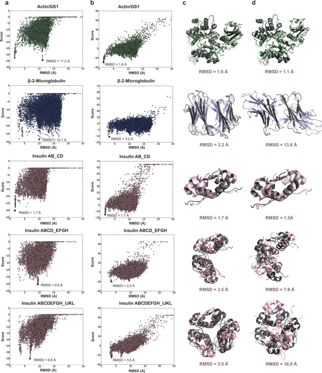 图 3. 使用 AlphaFold2 模型作为对接输入,为基准集中每个复合体生成的 10,000 个对接模型的晶体结构得分与 RMSD。