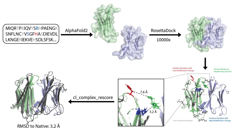 尽管 AF2 已被证明是一种出色的革命性蛋白质结构预测方法,但仍然存在局限性,尤其是对于蛋白质复合物。共价标记有可能帮助克服其中一些限制,而Rosetta特别适合开发将标记数据作为附加评分项的混合方法。在这里,我们使用 RosettaDock来组装使用 AF2 生成的蛋白质复合物亚基,并使用共价标记数据来改进蛋白质复合物结构预测。