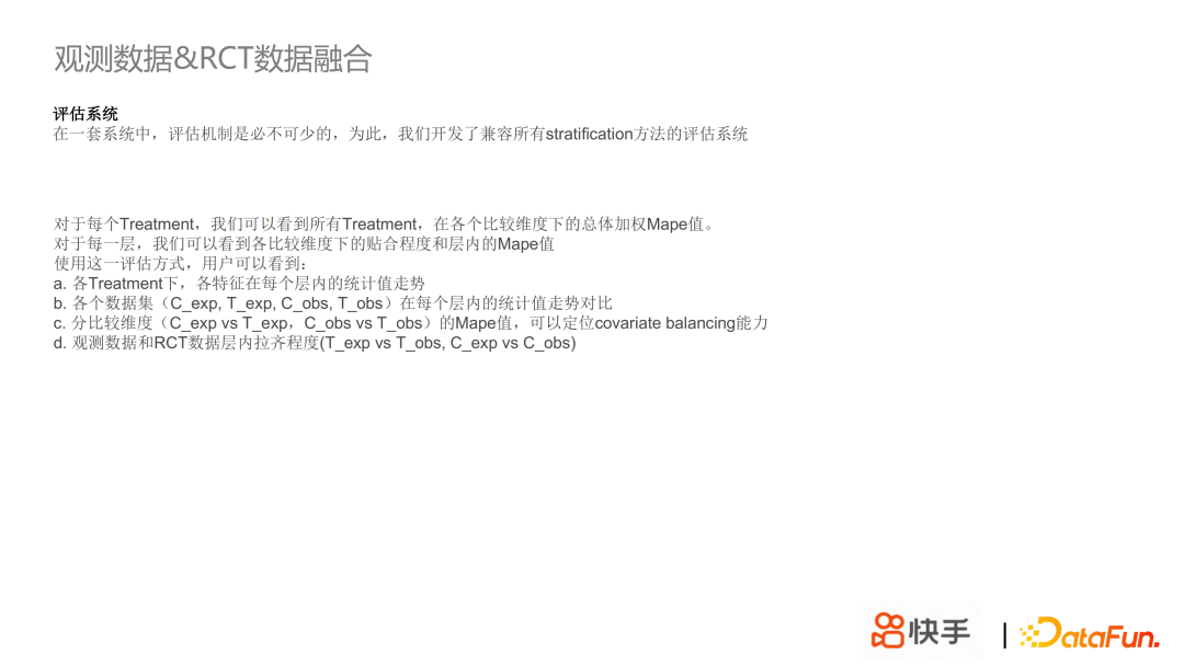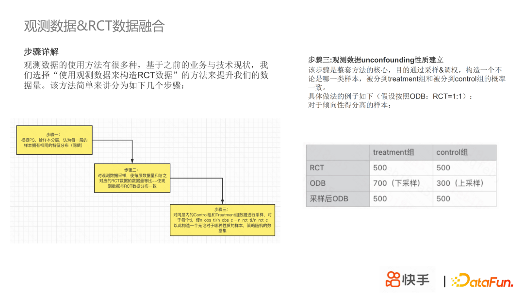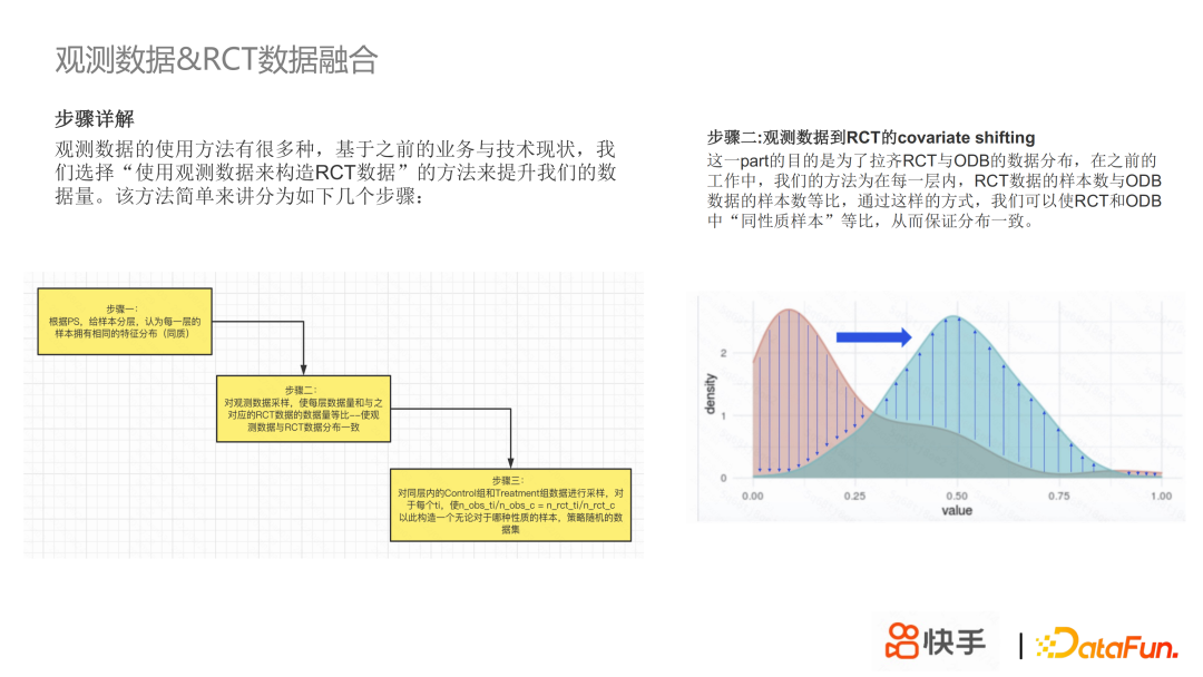 第三部分是 RCT 数据和观测数据的融合建模,RCT 数据虽然是无偏的,但是量少且贵,观测数据虽然有偏但是量大随处可得,所以我们希望通过 RCT 数据和观测数据融合建模,来提升数据量;