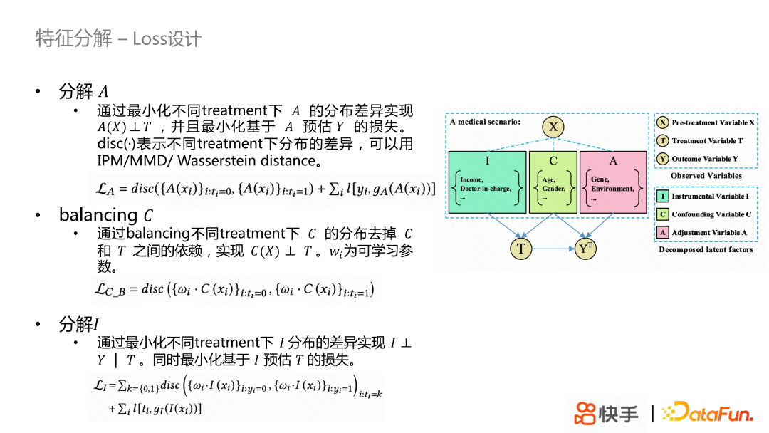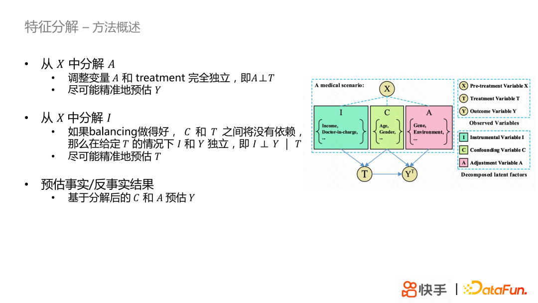 最后一部分是特征分解,它是目前比较热门学术研究方向,主要研究如何从特征里面去提取 confounder,adjustment variable 和 IV。