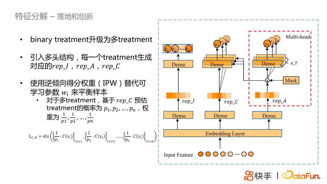 下面主要介绍特征分解的原始做法(参考发表在 TKDE2022上的一个工作),以及我们落地时做的一些改进。基于因果图(右边的图)可以看到,协变量 X 分解成工具变量 I,混淆变量 𝐶 和调整变量 A,从而准确地分离出 C 和 A 去预估 outcome(y),消除因为引入观测数据带来的 bias。从图中可以看到工具变量 I 是只影响 treatment,混淆变量 C 会影响 treatment 和outcome,调整变量 A 只会影响 outcome。