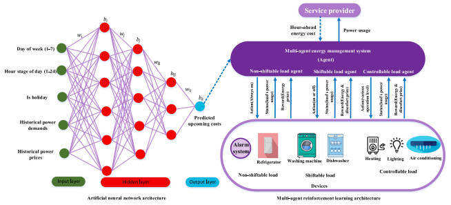 【推荐理由】面对不断变化的市场因素,能源管理 (EM) 系统需要具有灵活性以做出最佳的实时决策。需求响应(DR)已成为提高电气系统性能和可靠性的最新方法。在这里,针对家中的 EM 提出了一种提前一小时的 DR 算法。本文介绍了一种人工神经网络方法,该方法使用稳定的成本预测作为处理即将到来的价格不确定性的方法。为了为各种家用设备做出最佳和分散的决策,多智能体强化学习已与预测的即将到来的成本一起使用。本文对可移动、不可移动和可控负载进行了仿真,以确定所建议的 EM 策略的有效性。基于实验的结果,这种建议的 DR 算法能够处理多种设备的电磁波,最大限度地减少消费者的电费开支和不适价格,并帮助消费者大大降低其能源开支相比,基准使用没有 DR。