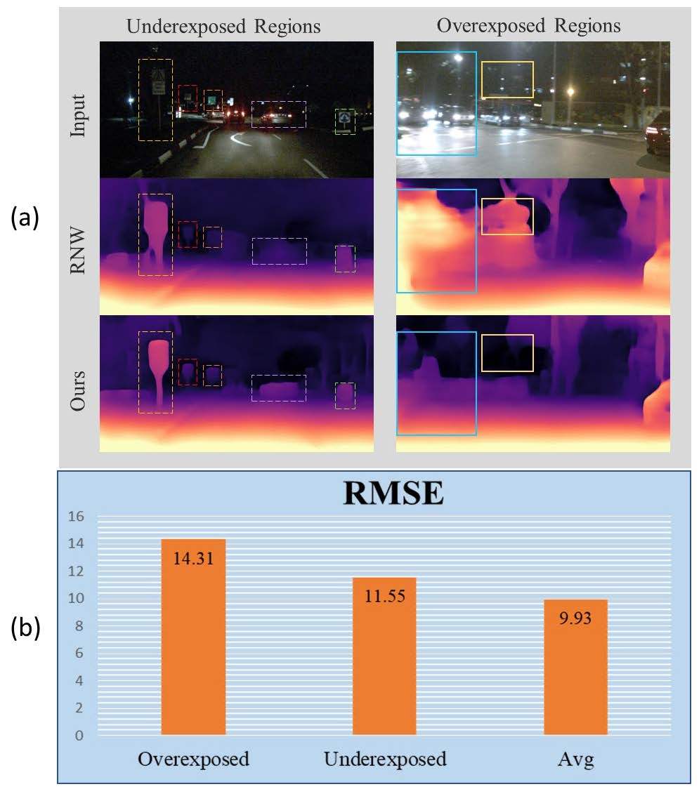然而在夜间环境下,图像中包含了大量的欠曝和过曝区域,它们在相邻帧之间有较明显的差异,同时掩盖了对应区域的有效信息,如图1(a)的第一行所示。我们在nuScenes数据集的测试集上评测了基线方法RNW预测的深度值和真值的均方根误差值(RMSE),同时我们人工挑选了其中100多个过曝和欠曝的场景,做了如图1(b)所示的统计结果。可以看出,在这两种特殊场景下,RNW的表现要低于平均水平,可视化效果如图1(a)的第二行所示。