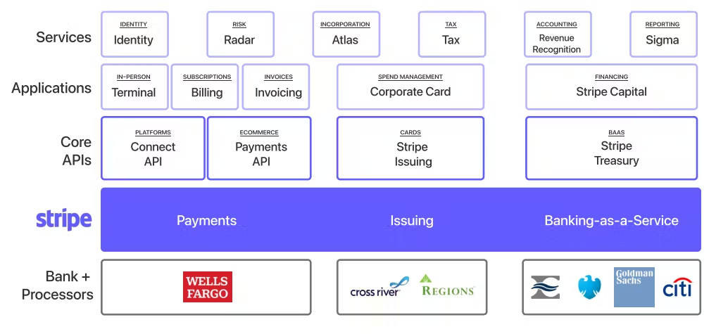 关于业务场景的叙述, Stripe 首席商务官 Billy Alvarado 曾描述道:“我们已经构建了一些非常复杂且不太容易访问的东西,特别是从互联网的角度来看不太容易访问”,在旧金山 Stripe 办公室里,Alvarado 在白板上绘制了一张复杂的图表,描绘了信用卡支付环环相扣的关系图,然后他在这些东西周围画了一个大圈并表示这就是 —— Stripe。