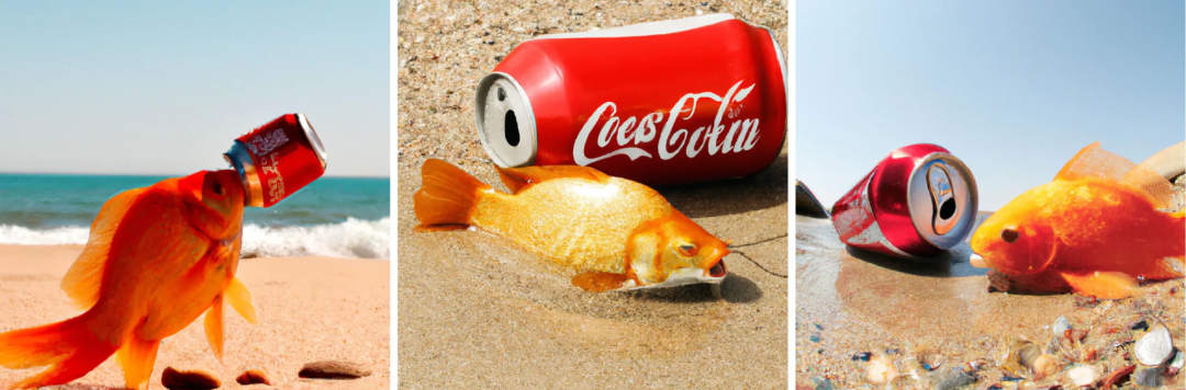 图1. DALL·E2 生成这些“金鱼在海滩上喝可口可乐”的图像。OpenAI 创建的这个程序可能从未遇到过类似的图像,但仍然可以生成它们。