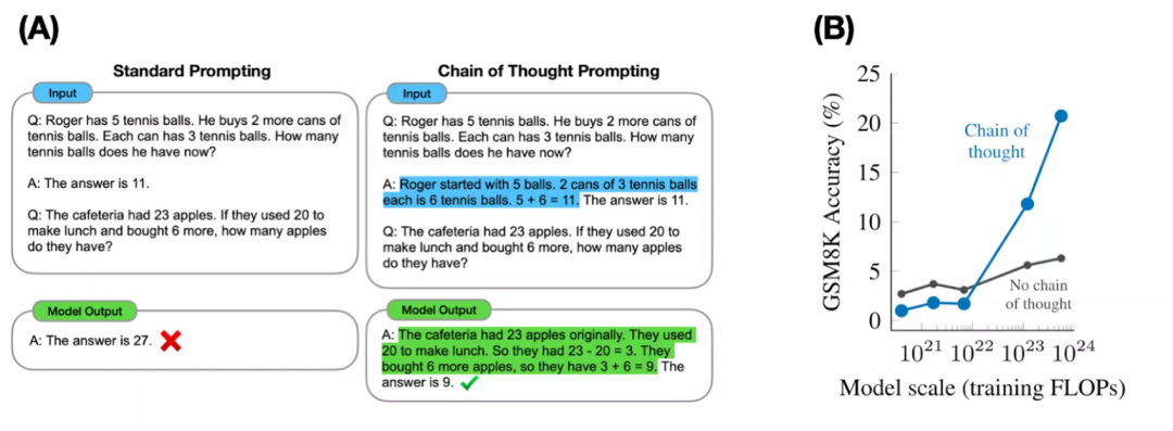 图2. (A) 思维链提示的案例,(B) 模型大小和思维链提示带来的准确性折线图。
