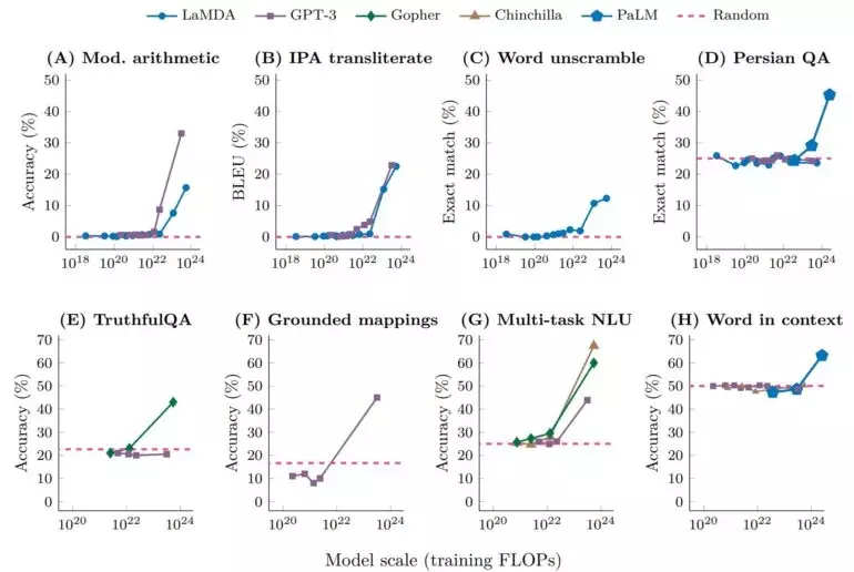 图1. 在多步计算、多任务语言理解和语境中的词汇含义三任务上,语言模型的准确度只有当模型规模(训练时的FLOPs)超过一个阈值时才突然提高。