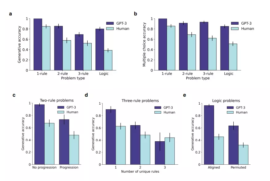 图5. 在生成及多选这两类问题上,需要运用的规则越多,GPT-3 的表现就越优于人类