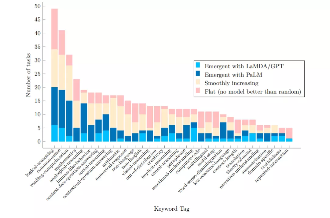 图6. 在BIG Bench模型中,在各类任务中,具有涌现特征(蓝色)、性能随模型大小线性增长(浅黄色)、以及所有模型都无法超过随机水平(橙红色)的任务个数。在类比推理、词义消歧、真实性、社会推理和情感理解这些任务中,具有涌现特征的任务比例最高;算术和数学相对较低;在逻辑推理、因果推理和视觉相关的任务中,具有涌现特征的任务比例最低。