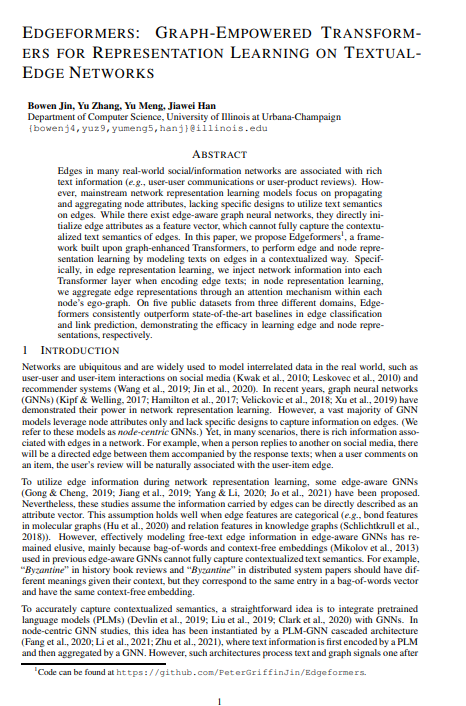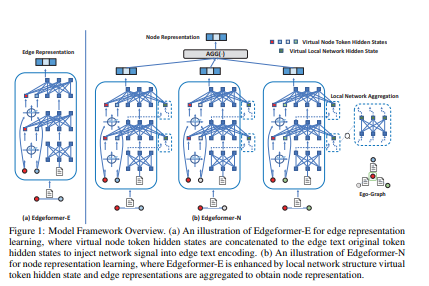 - 在方法上,提出了Edgeformers(即,Edgeformer-e和Edgeformer-N),这两种图形增强的Transformer架构,以上下文化的方式深度耦合网络和文本信息,用于边缘和节点表示学习。